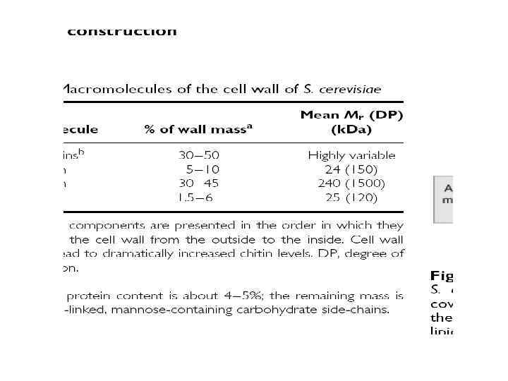 Белки • белковый компонент присутствует во всех слоях клеточных покровов грибов. Белки S. cerevisiae и C. albicans могут составлять от 30 до 50% от сухой массы клеточной стенки. У мицелиальных грибов – 20 -30%.