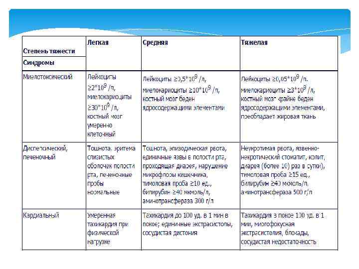 Лечебная тактика Важнейшим условием лечения является устранение причинного фактора Напоминает таковую при острой лучевой болезни. Пациентов в обязательном порядке изолируют, соблюдая все условия асептики. Основную роль отводят антибактериальной терапии, в случае необходимости при инфекционных процессах также назначают противовирусные средства, иммуностимуляторы, при кровотечениях переливают тромбомассу и т. д. , исходя из конкретной ситуации. Препараты вводят внутривенно, так как в местах внутримышечных инъекций могут легко образоваться абсцессы.