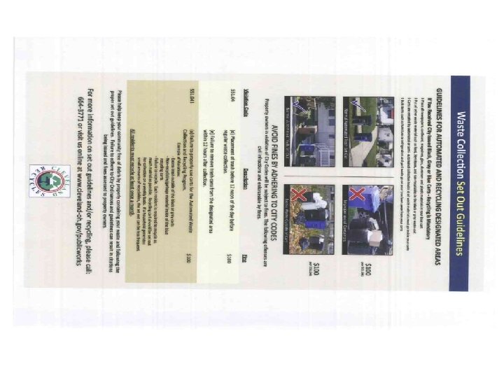 REGULATION Regulations codes are enforced by civil penalties via the clerk of courts. We also have a dual system for criminal penalties enforceable by the housing court. Ordinance Code No. 697 -10 Section 551. 991 Civil Infractions (1), (2), (3) and (4) Civil Penalty Description 551. 111(a) Setting out excessively large quantity of waste for collection greater than 2 cubic yards; less than 10 cubic yards Setting out excessively large quantity of waste for collection greater than 10 cubic yards 551. 041 (a) Automated Waste Collection and Recycling Infractions 551. 04 (d) Early set out of waste; 12 hours prior to pick-up 551. 04 (e) Relating to failing to remove a waste container after collection 12 hours after pick-up