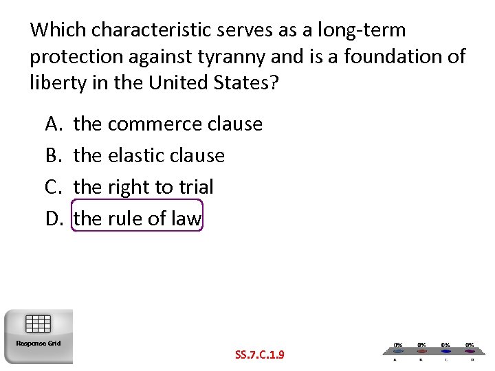 Which characteristic serves as a long-term protection against tyranny and is a foundation of liberty in the United States? A. B. C. D. Response Grid the commerce clause the elastic clause the right to trial the rule of law SS. 7. C. 1. 9