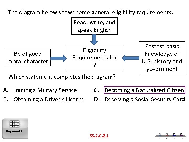 The diagram below shows some general eligibility requirements. Read, write, and speak English Be of good moral character Eligibility Requirements for ? Possess basic knowledge of U. S. history and government Which statement completes the diagram? A. Joining a Military Service B. Obtaining a Driver’s License Response Grid C. Becoming a Naturalized Citizen D. Receiving a Social Security Card SS. 7. C. 2. 1