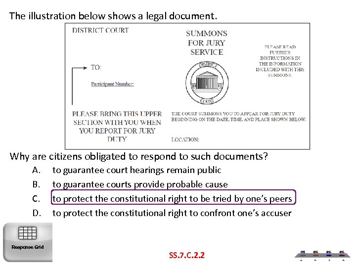 The illustration below shows a legal document. Why are citizens obligated to respond to such documents? A. B. C. D. Response Grid to guarantee court hearings remain public to guarantee courts provide probable cause to protect the constitutional right to be tried by one’s peers to protect the constitutional right to confront one’s accuser SS. 7. C. 2. 2