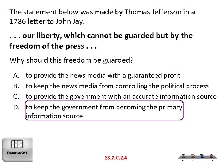 The statement below was made by Thomas Jefferson in a 1786 letter to John Jay. . our liberty, which cannot be guarded but by the freedom of the press. . . Why should this freedom be guarded? A. B. C. D. to provide the news media with a guaranteed profit to keep the news media from controlling the political process to provide the government with an accurate information source to keep the government from becoming the primary information source Response Grid SS. 7. C. 2. 4