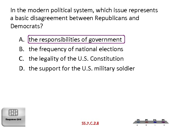 In the modern political system, which issue represents a basic disagreement between Republicans and Democrats? A. B. C. D. Response Grid the responsibilities of government the frequency of national elections the legality of the U. S. Constitution the support for the U. S. military soldier SS. 7. C. 2. 8