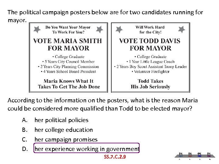 The political campaign posters below are for two candidates running for mayor. According to the information on the posters, what is the reason Maria could be considered more qualified than Todd to be elected mayor? A. B. C. D. her political policies her college education her campaign promises her experience working in government SS. 7. C. 2. 9