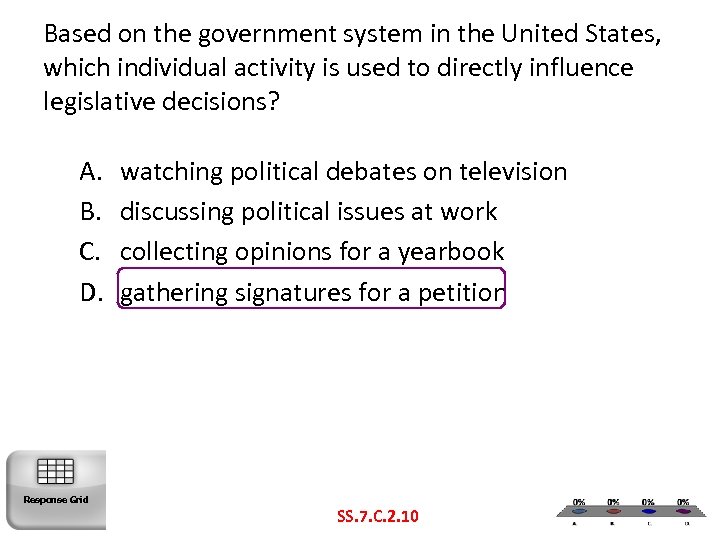 Based on the government system in the United States, which individual activity is used to directly influence legislative decisions? A. B. C. D. Response Grid watching political debates on television discussing political issues at work collecting opinions for a yearbook gathering signatures for a petition SS. 7. C. 2. 10