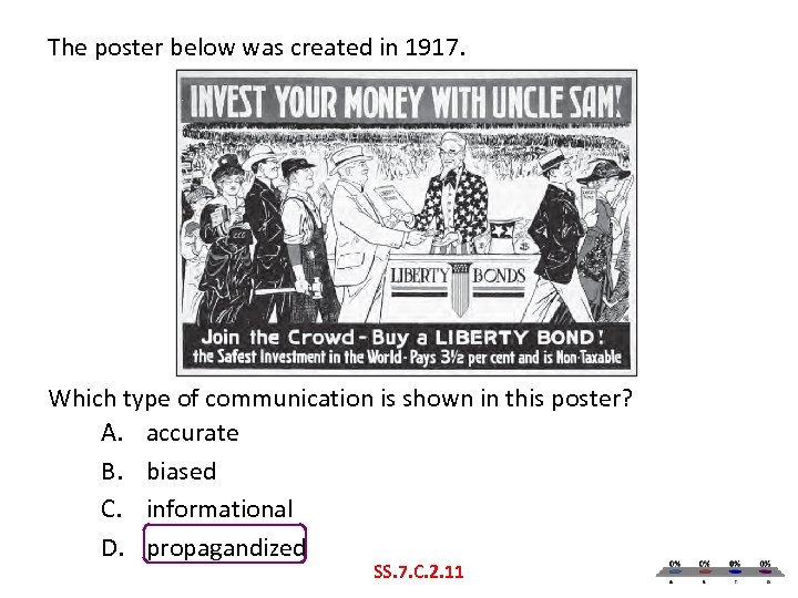 The poster below was created in 1917. Which type of communication is shown in this poster? A. accurate B. biased C. informational D. propagandized SS. 7. C. 2. 11