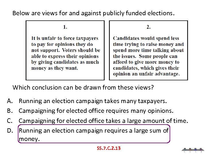 Below are views for and against publicly funded elections. Which conclusion can be drawn from these views? A. B. C. D. Running an election campaign takes many taxpayers. Campaigning for elected office requires many opinions. Campaigning for elected office takes a large amount of time. Running an election campaign requires a large sum of money. SS. 7. C. 2. 13