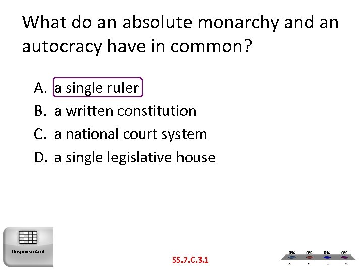 What do an absolute monarchy and an autocracy have in common? A. B. C. D. Response Grid a single ruler a written constitution a national court system a single legislative house SS. 7. C. 3. 1