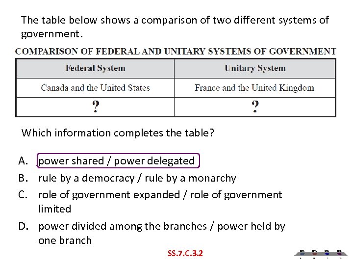 The table below shows a comparison of two different systems of government. Which information completes the table? A. power shared / power delegated B. rule by a democracy / rule by a monarchy C. role of government expanded / role of government limited D. power divided among the branches / power held by one branch SS. 7. C. 3. 2