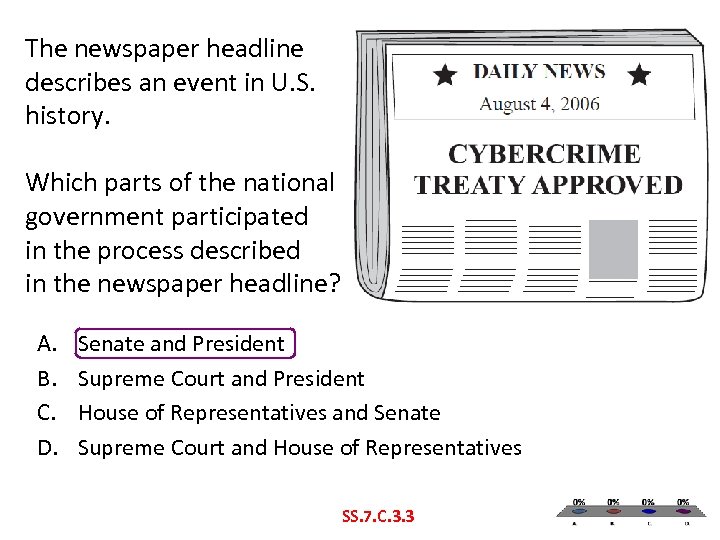 The newspaper headline describes an event in U. S. history. Which parts of the national government participated in the process described in the newspaper headline? A. B. C. D. Senate and President Supreme Court and President House of Representatives and Senate Supreme Court and House of Representatives SS. 7. C. 3. 3