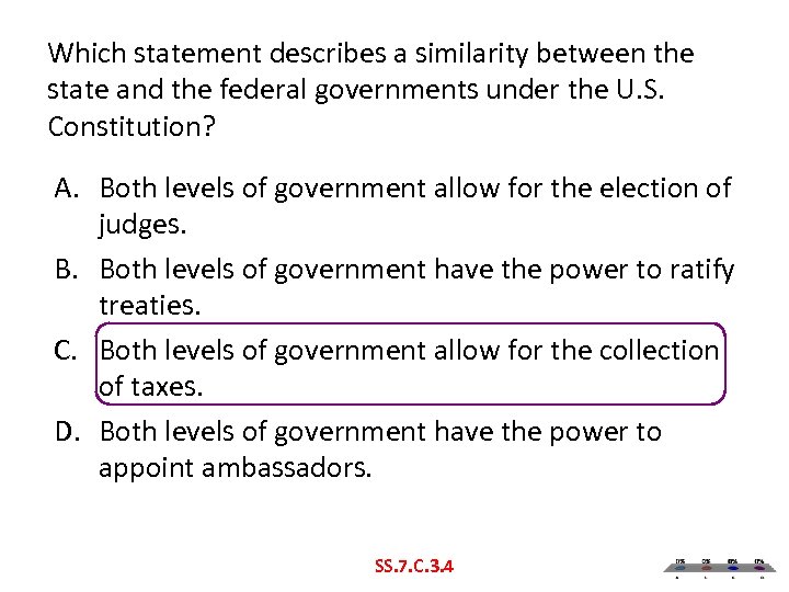 Which statement describes a similarity between the state and the federal governments under the U. S. Constitution? A. Both levels of government allow for the election of judges. B. Both levels of government have the power to ratify treaties. C. Both levels of government allow for the collection of taxes. D. Both levels of government have the power to appoint ambassadors. SS. 7. C. 3. 4