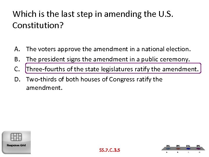 Which is the last step in amending the U. S. Constitution? A. B. C. D. Response Grid The voters approve the amendment in a national election. The president signs the amendment in a public ceremony. Three-fourths of the state legislatures ratify the amendment. Two-thirds of both houses of Congress ratify the amendment. SS. 7. C. 3. 5