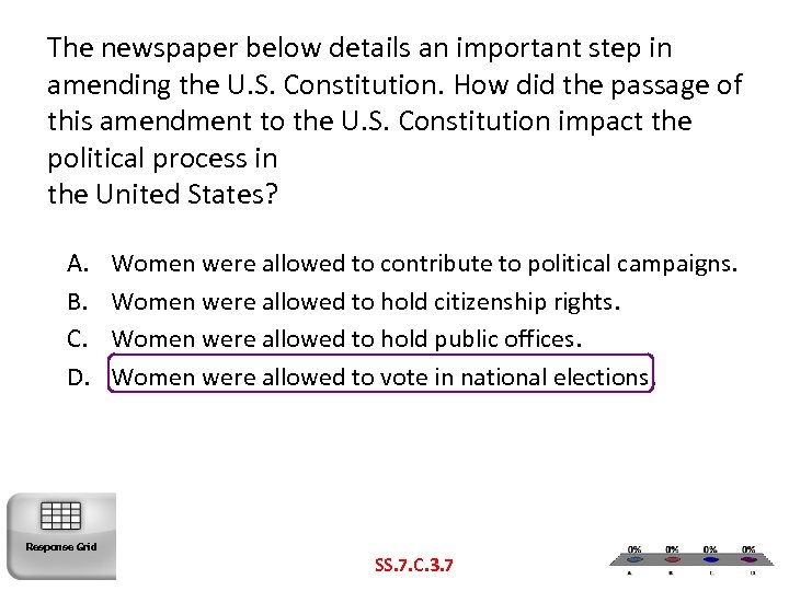 The newspaper below details an important step in amending the U. S. Constitution. How did the passage of this amendment to the U. S. Constitution impact the political process in the United States? A. B. C. D. Response Grid Women were allowed to contribute to political campaigns. Women were allowed to hold citizenship rights. Women were allowed to hold public offices. Women were allowed to vote in national elections. SS. 7. C. 3. 7