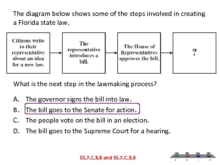 The diagram below shows some of the steps involved in creating a Florida state law. What is the next step in the lawmaking process? A. B. C. D. The governor signs the bill into law. The bill goes to the Senate for action. The people vote on the bill in an election. The bill goes to the Supreme Court for a hearing. SS. 7. C. 3. 8 and SS. 7. C. 3. 9