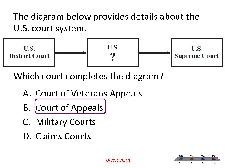 The diagram below provides details about the U. S. court system. Which court completes the diagram? A. B. C. D. Court of Veterans Appeals Court of Appeals Military Courts Claims Courts SS. 7. C. 3. 11