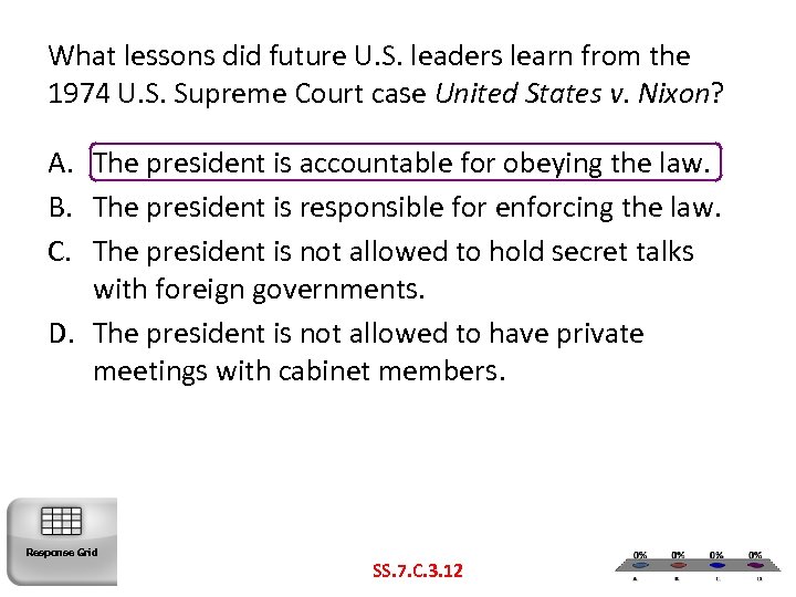 What lessons did future U. S. leaders learn from the 1974 U. S. Supreme Court case United States v. Nixon? A. The president is accountable for obeying the law. B. The president is responsible for enforcing the law. C. The president is not allowed to hold secret talks with foreign governments. D. The president is not allowed to have private meetings with cabinet members. Response Grid SS. 7. C. 3. 12