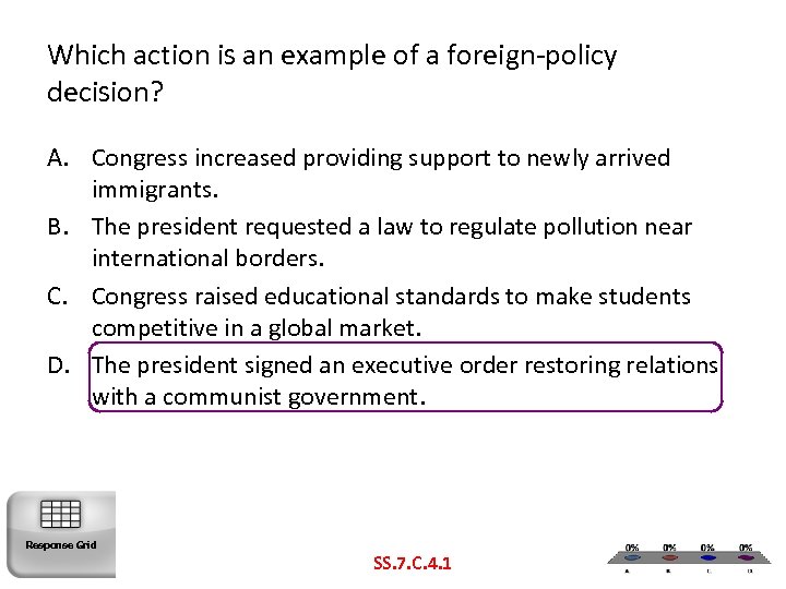 Which action is an example of a foreign-policy decision? A. Congress increased providing support to newly arrived immigrants. B. The president requested a law to regulate pollution near international borders. C. Congress raised educational standards to make students competitive in a global market. D. The president signed an executive order restoring relations with a communist government. Response Grid SS. 7. C. 4. 1