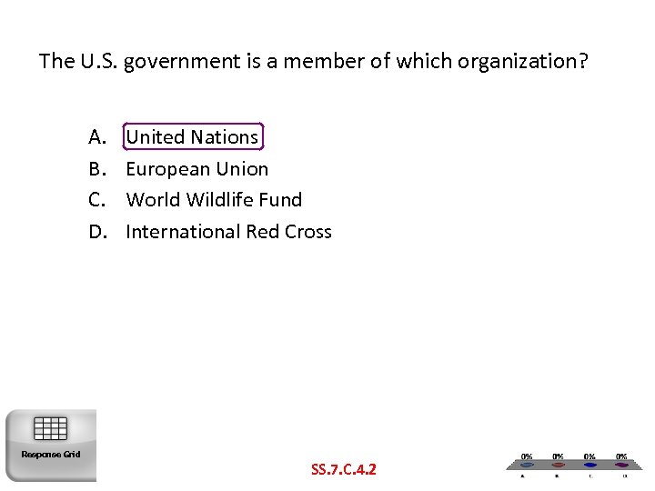 The U. S. government is a member of which organization? A. B. C. D. Response Grid United Nations European Union World Wildlife Fund International Red Cross SS. 7. C. 4. 2