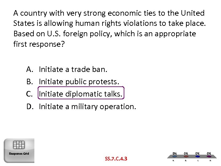 A country with very strong economic ties to the United States is allowing human rights violations to take place. Based on U. S. foreign policy, which is an appropriate first response? A. B. C. D. Response Grid Initiate a trade ban. Initiate public protests. Initiate diplomatic talks. Initiate a military operation. SS. 7. C. 4. 3
