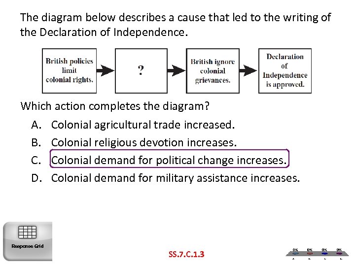 The diagram below describes a cause that led to the writing of the Declaration of Independence. Which action completes the diagram? A. B. C. D. Response Grid Colonial agricultural trade increased. Colonial religious devotion increases. Colonial demand for political change increases. Colonial demand for military assistance increases. SS. 7. C. 1. 3