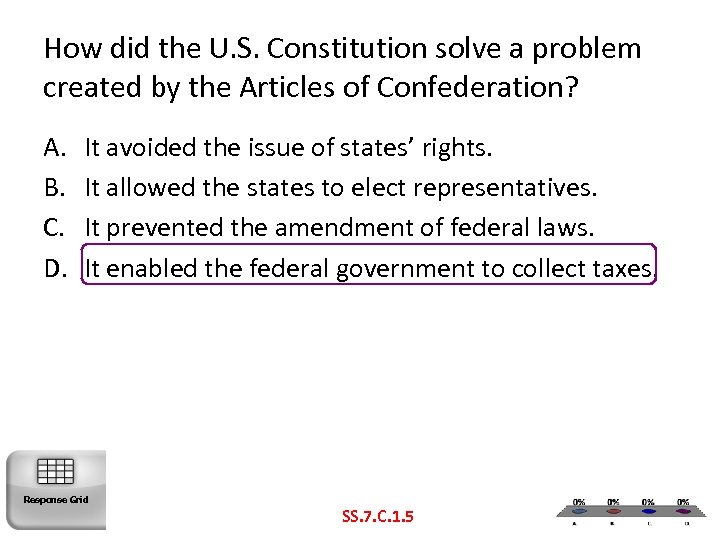 How did the U. S. Constitution solve a problem created by the Articles of Confederation? A. B. C. D. It avoided the issue of states’ rights. It allowed the states to elect representatives. It prevented the amendment of federal laws. It enabled the federal government to collect taxes. Response Grid SS. 7. C. 1. 5