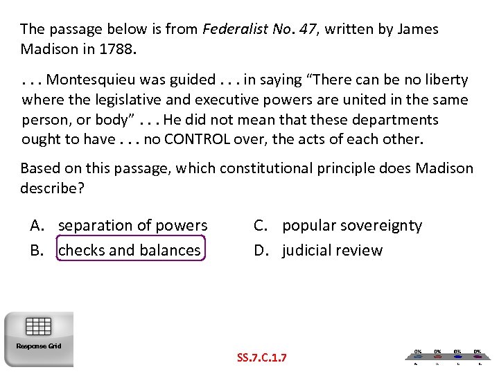 The passage below is from Federalist No. 47, written by James Madison in 1788. . Montesquieu was guided. . . in saying “There can be no liberty where the legislative and executive powers are united in the same person, or body”. . . He did not mean that these departments ought to have. . . no CONTROL over, the acts of each other. Based on this passage, which constitutional principle does Madison describe? A. separation of powers B. checks and balances Response Grid C. popular sovereignty D. judicial review SS. 7. C. 1. 7