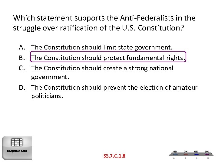 Which statement supports the Anti-Federalists in the struggle over ratification of the U. S. Constitution? A. The Constitution should limit state government. B. The Constitution should protect fundamental rights. C. The Constitution should create a strong national government. D. The Constitution should prevent the election of amateur politicians. Response Grid SS. 7. C. 1. 8