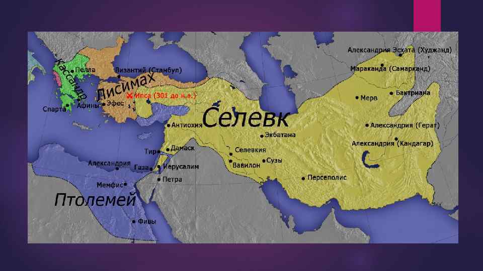 5. Эллинизм В 338 г. До н. э. Греция была подчинена Македонии. Объединение сил Греции и Македонии позволили Александру Македонскому завоевать Персидское государство. Держава македонского распалась сразу же поле его смерти (323 г. До н. э. ) После распада империи Александра возникаю эллинистические государства во главе с полководцами Македонского объявившими себя царями.