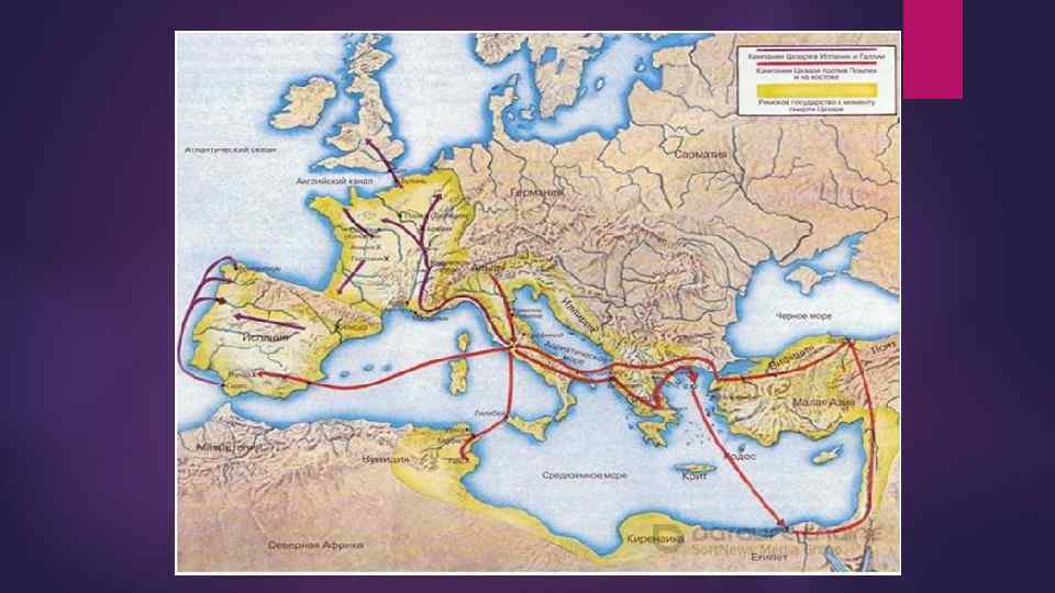 6. Римский мир Средиземного моря Рим (753 г. До н. э. ) Господство земледельческой аристократии. Изначально власть царей →падение царской власти → становление республиканского правления (единоначалие консулов, власть сената, народное собрание). Войны между патрициями и плебеями приводит к формированию гражданского равноправия. Основа экономики – труд рабов. Труд свободных крестьян и ремесленников утратил свою роль в жизни римского полиса. В к. I в. До н. э. власть переходит к императору – пожизненный военный диктатор, обладавший всей полнотой административной и судебной власти. В н. III в. До н. э. жители завоёванных провинций получили право римского гражданства.