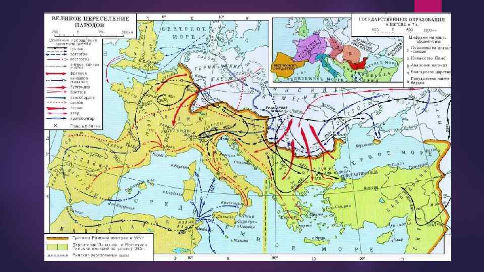 8. Великое переселение народов В к. IV в. Отряды варварских племен прорвались через границу Римской империи. Массовое движение племён охватившее огромное пространство Европы и Азии, получило название Великого Переселения Народов. Начало ВПН положили племена гуннов. Спасаясь от кочевников германские племена начали массовое переселение в пределы Римской империи. 378 г. – восстание племён готов. В сражении при Андреаполе римляне были разбиты –заключение мирного договора. 395 г. Смерть императора Феодосия Великого. Разделение империи на Восточную (Константинополь) и Западную (Равена). В 455 г. Рим был взят и разграблен воинами германского племени вандалов. В 476 г. – вождь германского племени Одокар сместил последнего императора Равены Ромула Августа, объявив себя правителем Италии.