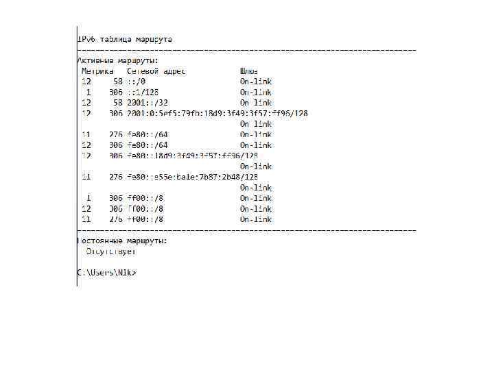 Формат адреса IPv 6 Префикс Узел (Идентификатор интерфейса) Длина префикса Префикс – диапазон или блок последовательных адресов IPv 6 (ID-сети в IPv 4). Длина префикса – десятичное число равное количеству разрядов в префиксе. Длина префикса записывается как /N (маска подсети в IPv 4) /64 Пример. 2000: 1234: 5678: 9 ABC: DEF 1: 2345: 6789: 1111 /64 – полный 128 -разрядный адрес. /64 означает, что префикс (подсеть) в которой находится этот адрес 2000: 1234: 5678: 9 ABC: 0: 0 /64 или 2000: 1234: 5678: 9 ABC: : /64 При записи префикса (адреса сети в IPv 4) все биты, находящиеся за длиной префикса (идентификатор интерфейса) устанавливаются в ноль. Пример. полный 128 -разрядный адрес: 2000: 1234: 5678: 9 ABC: DEF 1: 2345: 6789: 1111 /56 Префикс: 2000: 1234: 5678: 9 A 00: 0000: 0000 /56 или 2000: 1234: 5678: 9 A 00: : /56