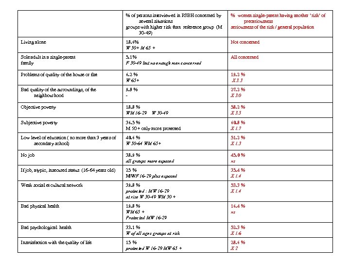 % of persons interviewed in PSBH concerned by several situations groups with higher risk than reference group (M 30 -49) % women single-parent having another ‘risk’ of precariousness seriousness of the risk / general population Living alone 18. 6% W 50+ M 65 + Not concerned Sole adult in a single-parent family 5. 1% F 30 -49 but no enough men concerned All concerned Problems of quality of the house or flat 6. 2 % W 65+ 19. 2 % X 3. 3 Bad quality of the surroundings, of the neighbourhood 9. 8 % - 27. 2 % X 3. 0 Objective poverty 18. 8 % WM 16 -29 W 30 -49 58. 2 % X 3. 5 Subjective poverty 36. 5 % M 50 + only more protected 60. 8 % X 1. 7 Low level of education ( no more than 3 years of secondary school) 40. 6 % W 50 -64 WM 65+ 51. 2 % X 1. 3 No job 38. 9 % all groups more exposed 45. 0 % ns If job, atypic, insecured status (16 -64 years old) 25 % MWF 16 -29 plus exposed 35. 4 % X 1. 4 Weak social et cultural network 39. 8 % protected : MW 16 -29 at rise W 30 -49 WM 50 + 53. 3 % X 1. 4 Bad physical health 19. 8 % WM 65 + Protected MW 16 -29 16. 4 % ns Bad psychological health 33. 1 % W of all ages groups at risk 52. 3 % X 1. 6 Insatisfaction with the quality of life 15 % protected W 16 -29 MW 65 + 28. 6 % X 2