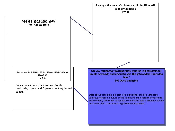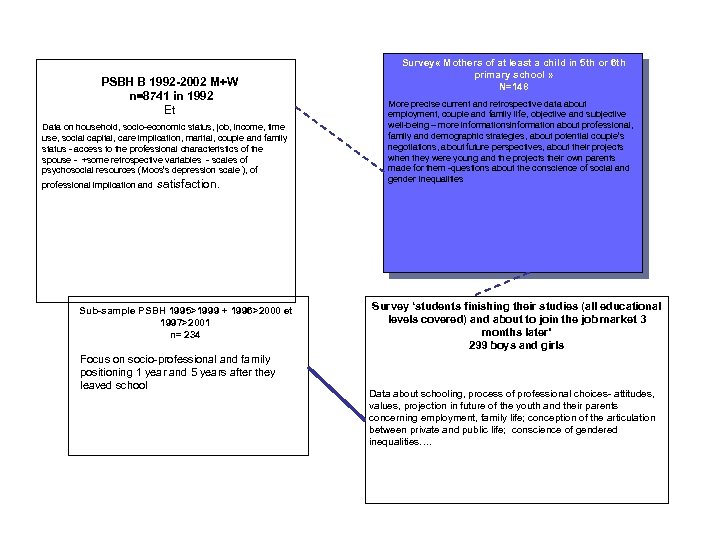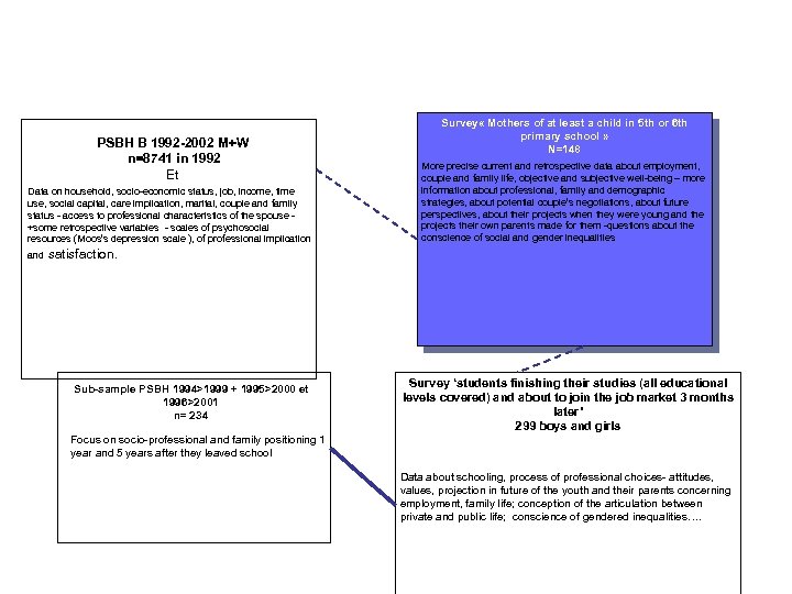PSBH B 1992 -2002 M+W n=8741 in 1992 Et Data on household, socio-economic status, job, income, time use, social capital, care implication, marital, couple and family status - access to professional characteristics of the spouse +some retrospective variables - scales of psychosocial resources (Moos’s depression scale ), of professional implication and Survey « Mothers of at least a child in 5 th or 6 th primary school » N=148 More precise current and retrospective data about employment, couple and family life, objective and subjective well-being – more information about professional, family and demographic strategies, about potential couple’s negotiations, about future perspectives, about their projects when they were young and the projects their own parents made for them -questions about the conscience of social and gender inequalities satisfaction. Sub-sample PSBH 1994>1999 + 1995>2000 et 1996>2001 n= 234 Focus on socio-professional and family positioning 1 year and 5 years after they leaved school Survey ‘students finishing their studies (all educational levels covered) and about to join the job market 3 months later’ 299 boys and girls Data about schooling, process of professional choices- attitudes, values, projection in future of the youth and their parents concerning employment, family life; conception of the articulation between private and public life; conscience of gendered inequalities….