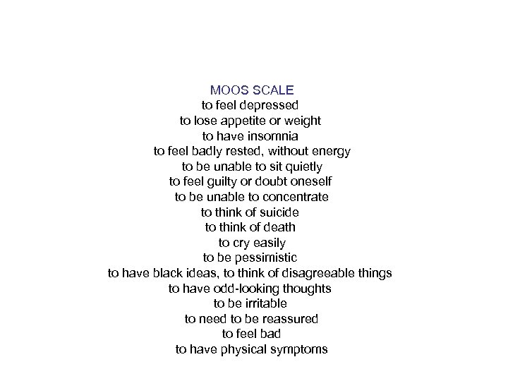 MOOS SCALE to feel depressed to lose appetite or weight to have insomnia to feel badly rested, without energy to be unable to sit quietly to feel guilty or doubt oneself to be unable to concentrate to think of suicide to think of death to cry easily to be pessimistic to have black ideas, to think of disagreeable things to have odd-looking thoughts to be irritable to need to be reassured to feel bad to have physical symptoms