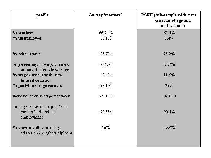 profile Survey ‘mothers’ PSBH (sub-sample with same criterias of age and motherhood) % workers % unemployed 66. 2. % 10. 1% 65. 4% 9. 4% % other status 23. 7% 25. 2% % percentage of wage earners among the female workers % wage earners with time limited contract % part-time wage earners 86. 2% 83. 7% 12. 4% 11. 6% 37. 1% 39% work hours on average per week 32 H 30 34 H 20 92. 3% 90. 4% 56% 59. 9% among women in couple, % of partner/husband in employment % women with secondary education as highest diploma