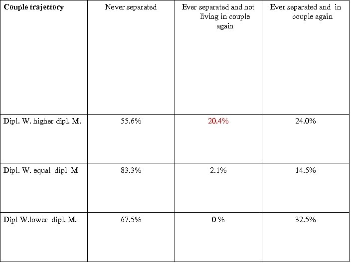 Couple trajectory Never separated Ever separated and not living in couple again Ever separated and in couple again Dipl. W. higher dipl. M. 55. 6% 20. 4% 24. 0% Dipl. W. equal dipl M 83. 3% 2. 1% 14. 5% Dipl W. lower dipl. M. 67. 5% 0 % 32. 5%
