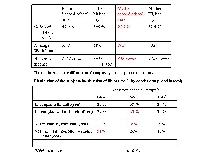 Father Second. school max father higher dipl Mother second. school max Mother Higher dipl % job of +35 H/ week 89. 9 % 100 % 29. 9 % 81. 8 % Average Work hours 39. 8 48. 6 26. 9 40. 6 Net work income 1251 euros 1641 euros 848 euros 1261 euros The results also show differences of temporality in demographic transitions. Distribution of the subjects by situation of life at time 2 (by gender group and in total) Situation de vie au temps 2 Men Women Total In couple, with child(ren) 20 % 33 % 25 % In couple, without 29 % 33 % 31 % Not in couple, with child(ren) 0 % 8 % 3 % Not in en couple, without child(ren) 51% 26% 41% child(ren) PSBH sub-sample p< 0. 001