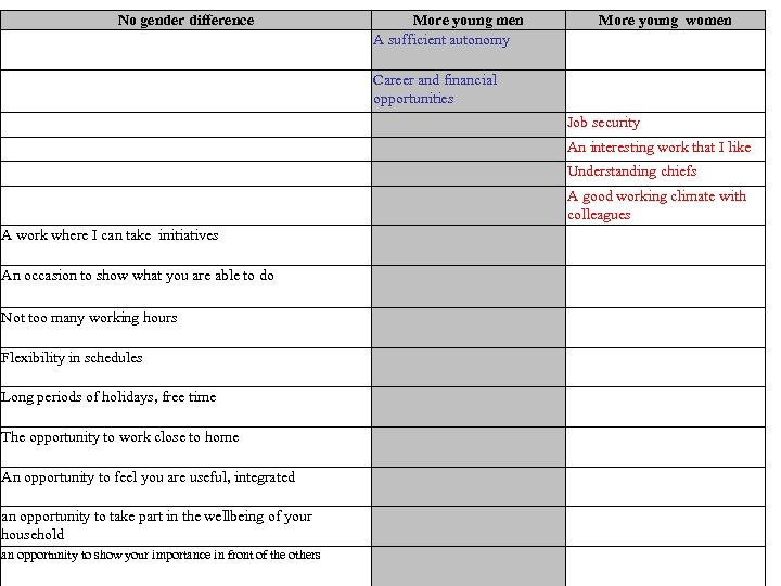 No gender difference More young men A sufficient autonomy More young women Career and financial opportunities Job security An interesting work that I like Understanding chiefs A good working climate with colleagues A work where I can take initiatives An occasion to show what you are able to do Not too many working hours Flexibility in schedules Long periods of holidays, free time The opportunity to work close to home An opportunity to feel you are useful, integrated an opportunity to take part in the wellbeing of your household an opportunity to show your importance in front of the others
