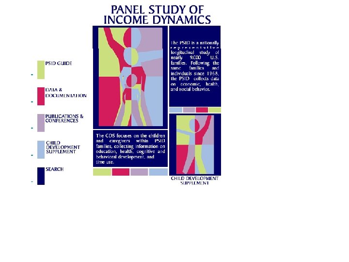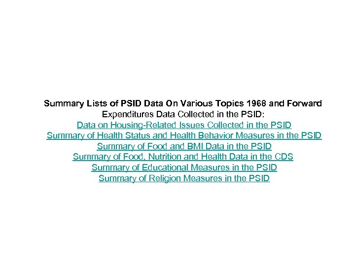 Summary Lists of PSID Data On Various Topics 1968 and Forward Expenditures Data Collected in the PSID: Data on Housing-Related Issues Collected in the PSID Summary of Health Status and Health Behavior Measures in the PSID Summary of Food and BMI Data in the PSID Summary of Food, Nutrition and Health Data in the CDS Summary of Educational Measures in the PSID Summary of Religion Measures in the PSID