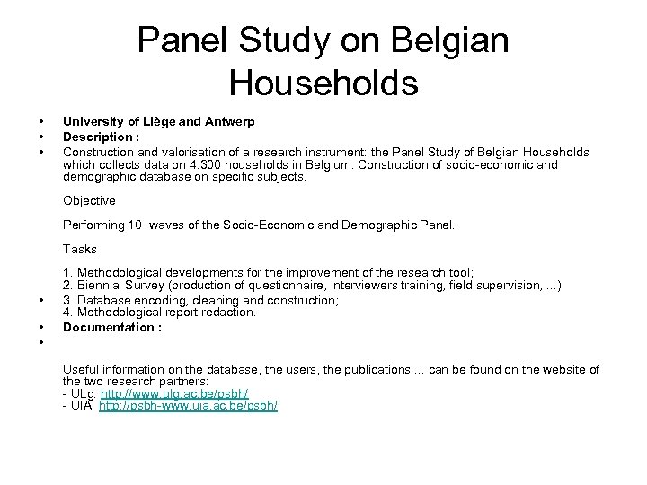 Panel Study on Belgian Households • • • University of Liège and Antwerp Description : Construction and valorisation of a research instrument: the Panel Study of Belgian Households which collects data on 4. 300 households in Belgium. Construction of socio-economic and demographic database on specific subjects. Objective Performing 10 waves of the Socio-Economic and Demographic Panel. Tasks • • • 1. Methodological developments for the improvement of the research tool; 2. Biennial Survey (production of questionnaire, interviewers training, field supervision, . . . ) 3. Database encoding, cleaning and construction; 4. Methodological report redaction. Documentation : Useful information on the database, the users, the publications. . . can be found on the website of the two research partners: - ULg: http: //www. ulg. ac. be/psbh/ - UIA: http: //psbh-www. uia. ac. be/psbh/