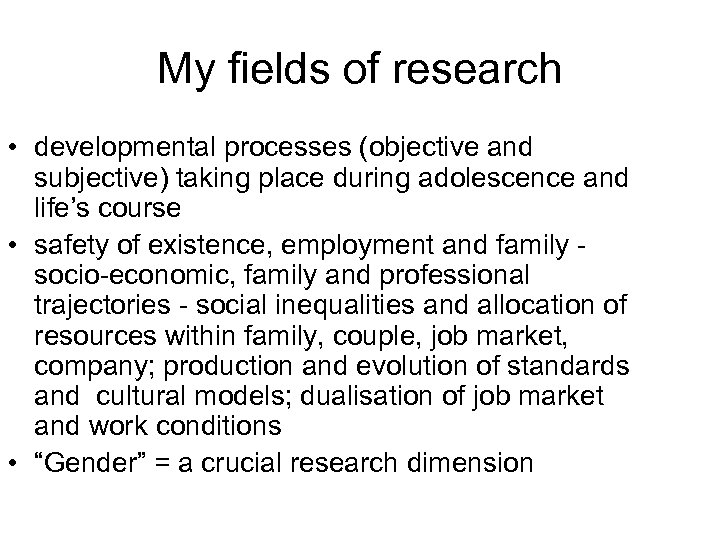 My fields of research • developmental processes (objective and subjective) taking place during adolescence and life’s course • safety of existence, employment and family socio-economic, family and professional trajectories - social inequalities and allocation of resources within family, couple, job market, company; production and evolution of standards and cultural models; dualisation of job market and work conditions • “Gender” = a crucial research dimension