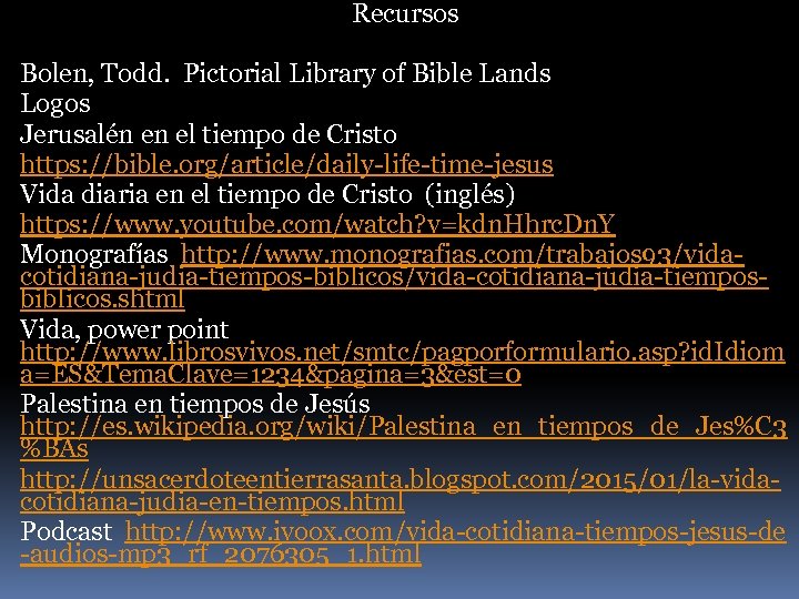 Recursos Bolen, Todd. Pictorial Library of Bible Lands Logos Jerusalén en el tiempo de Cristo https: //bible. org/article/daily-life-time-jesus Vida diaria en el tiempo de Cristo (inglés) https: //www. youtube. com/watch? v=kdn. Hhrc. Dn. Y Monografías http: //www. monografias. com/trabajos 93/vidacotidiana-judia-tiempos-biblicos/vida-cotidiana-judia-tiemposbiblicos. shtml Vida, power point http: //www. librosvivos. net/smtc/pagporformulario. asp? id. Idiom a=ES&Tema. Clave=1234&pagina=3&est=0 Palestina en tiempos de Jesús http: //es. wikipedia. org/wiki/Palestina_en_tiempos_de_Jes%C 3 %BAs http: //unsacerdoteentierrasanta. blogspot. com/2015/01/la-vidacotidiana-judia-en-tiempos. html Podcast http: //www. ivoox. com/vida-cotidiana-tiempos-jesus-de -audios-mp 3_rf_2076305_1. html