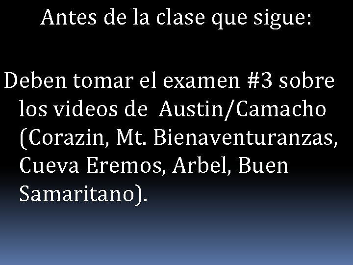 Antes de la clase que sigue: Deben tomar el examen #3 sobre los videos de Austin/Camacho (Corazin, Mt. Bienaventuranzas, Cueva Eremos, Arbel, Buen Samaritano).