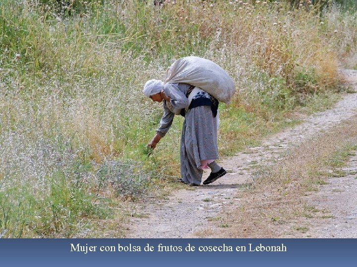 Mujer con bolsa de frutos de cosecha en Lebonah