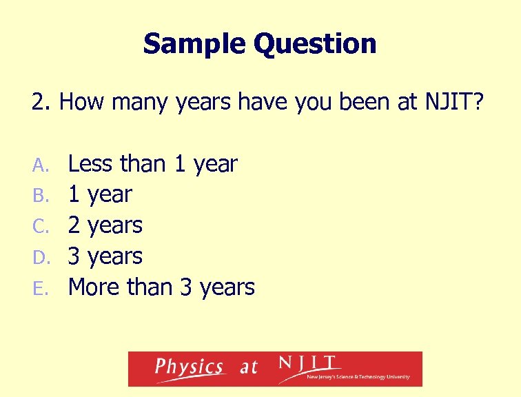 Sample Question 2. How many years have you been at NJIT? A. B. C. D. E. Less than 1 year 2 years 3 years More than 3 years