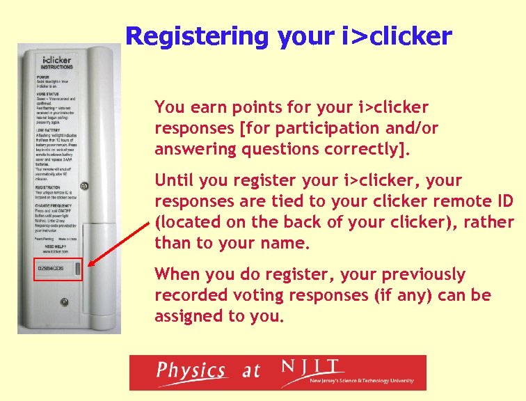Registering your i>clicker You earn points for your i>clicker responses [for participation and/or answering questions correctly]. Until you register your i>clicker, your responses are tied to your clicker remote ID (located on the back of your clicker), rather than to your name. When you do register, your previously recorded voting responses (if any) can be assigned to you.