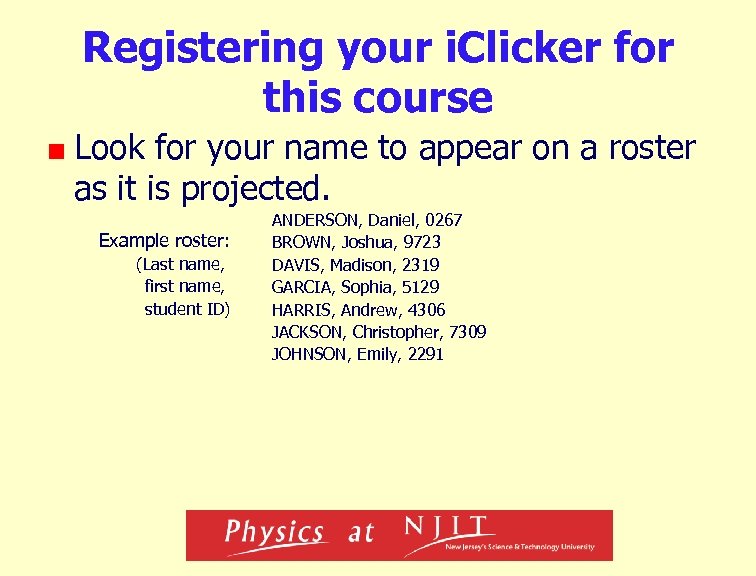 Registering your i. Clicker for this course Look for your name to appear on a roster as it is projected. Example roster: (Last name, first name, student ID) ANDERSON, Daniel, 0267 BROWN, Joshua, 9723 DAVIS, Madison, 2319 GARCIA, Sophia, 5129 HARRIS, Andrew, 4306 JACKSON, Christopher, 7309 JOHNSON, Emily, 2291