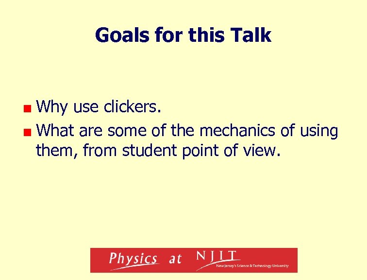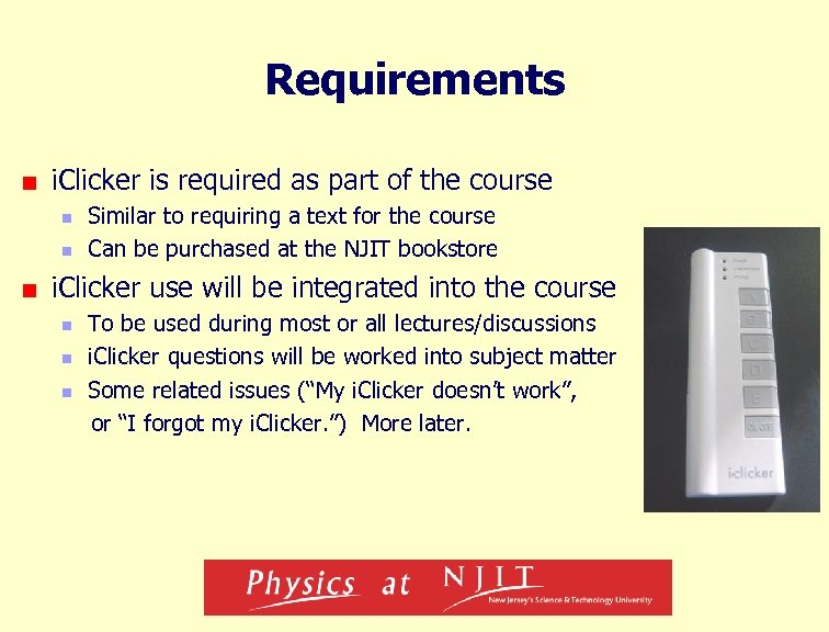 Requirements i. Clicker is required as part of the course n n Similar to requiring a text for the course Can be purchased at the NJIT bookstore i. Clicker use will be integrated into the course n n n To be used during most or all lectures/discussions i. Clicker questions will be worked into subject matter Some related issues (“My i. Clicker doesn’t work”, or “I forgot my i. Clicker. ”) More later.