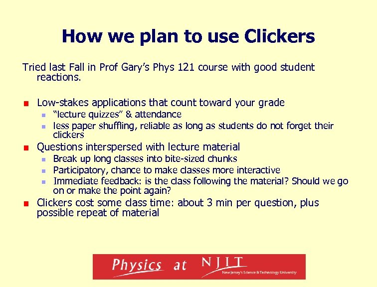 How we plan to use Clickers Tried last Fall in Prof Gary’s Phys 121 course with good student reactions. Low-stakes applications that count toward your grade n n “lecture quizzes” & attendance less paper shuffling, reliable as long as students do not forget their clickers Questions interspersed with lecture material n n n Break up long classes into bite-sized chunks Participatory, chance to make classes more interactive Immediate feedback: is the class following the material? Should we go on or make the point again? Clickers cost some class time: about 3 min per question, plus possible repeat of material